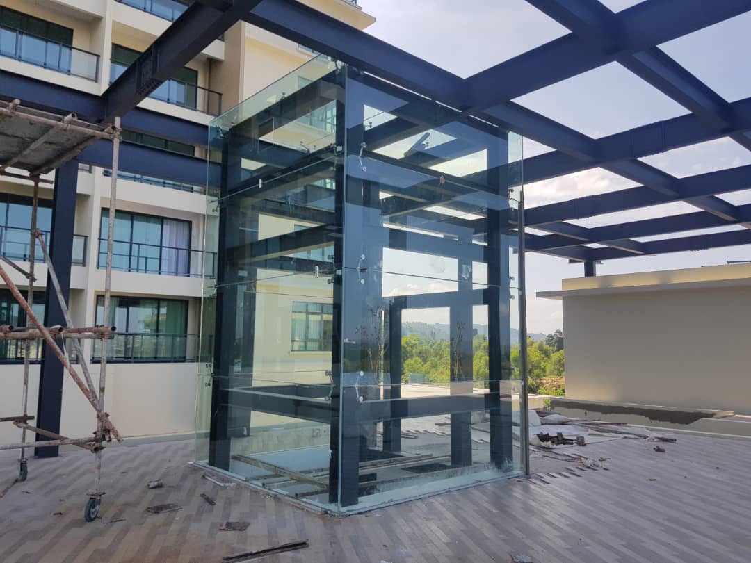 Installation of the passenger glass lift in progress.